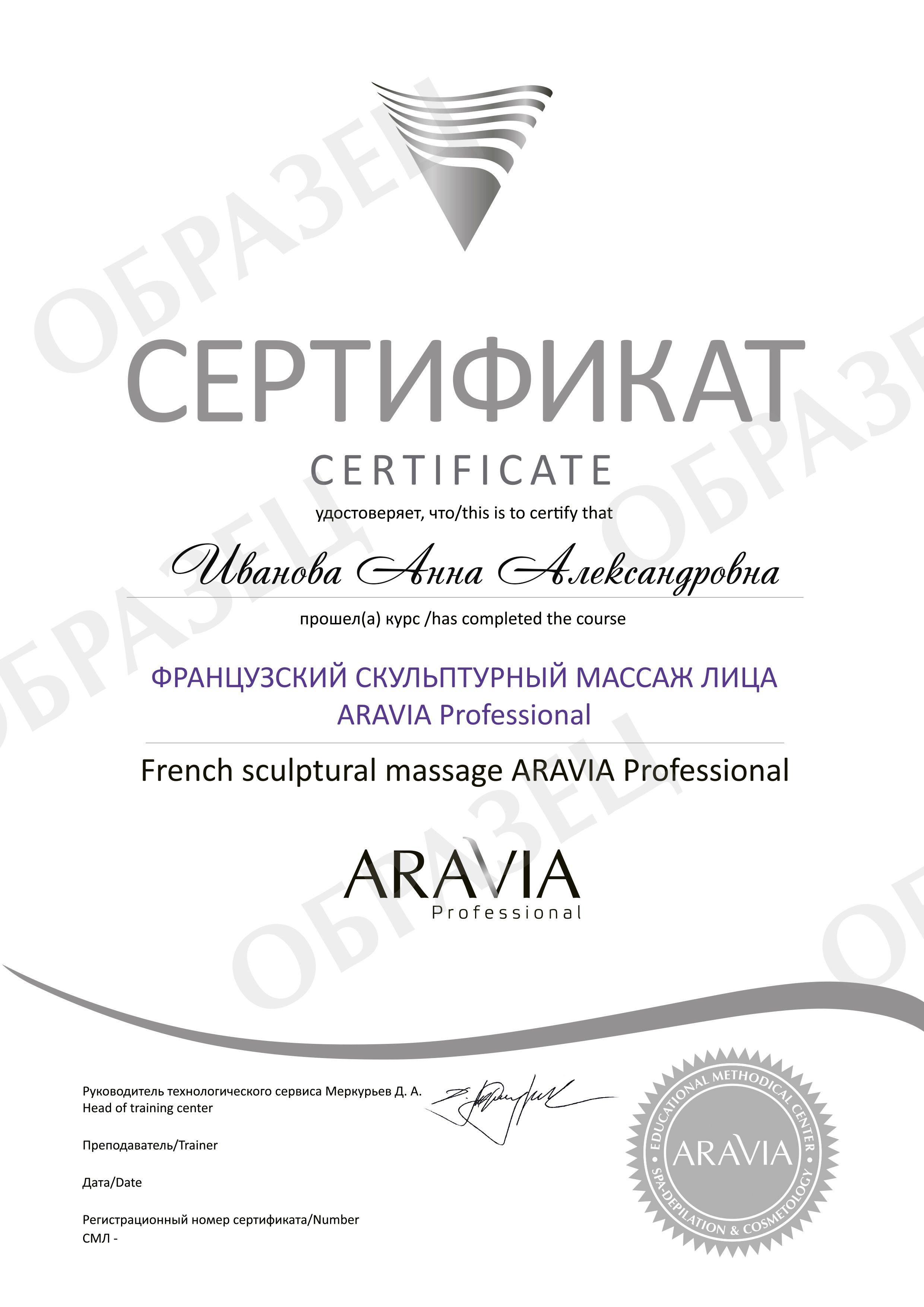 После прохождения курса участники получат методическое пособие косметолога ARAVIA Professional, пособие по массажу и именной сертификат о прохождении обучения по направлению «Французский скульптурный массаж лица ARAVIA Professional».